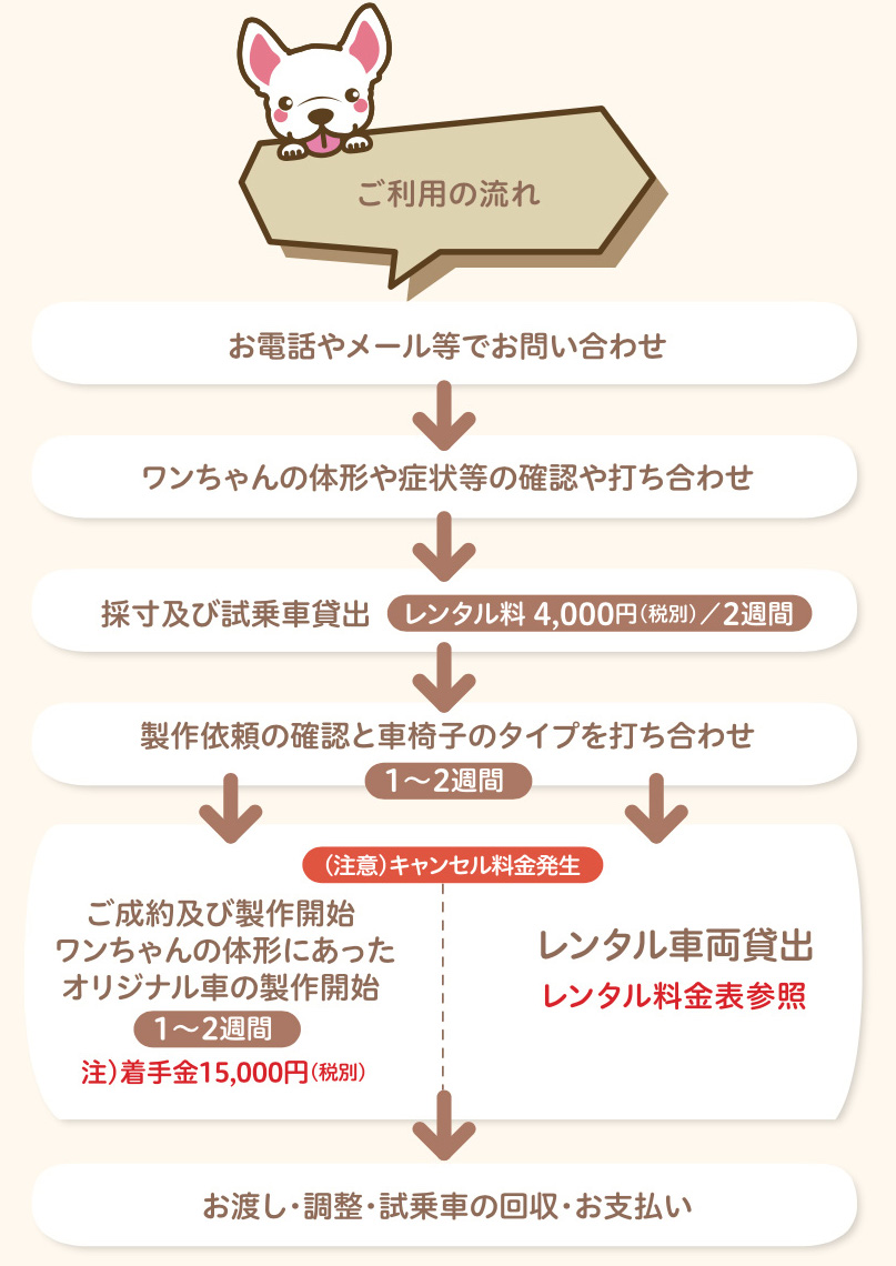 徹底した乗り心地を提供出来る様に採寸から調整までを徹底サポートワンちゃんの症状が変化した場合でも二輪から四輪へのリメイクが可能です。
